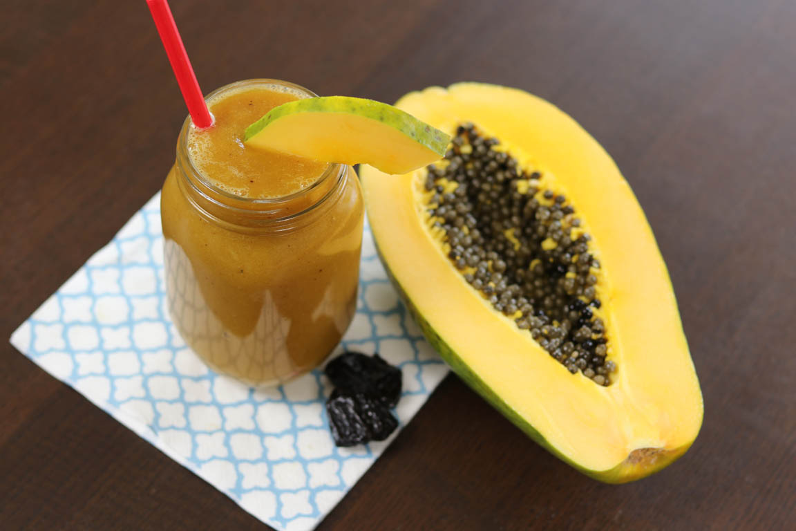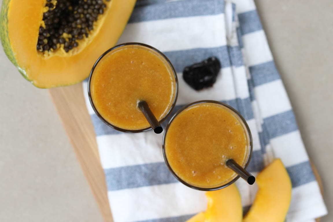 Receta de smoothie o batido de papaya utilizando como base líquida una infusión de menta. La papaya es una fruta muy digestiva. Contiene papaína que es una enzima proteolítica que nos ayuda a digerir las proteínas.