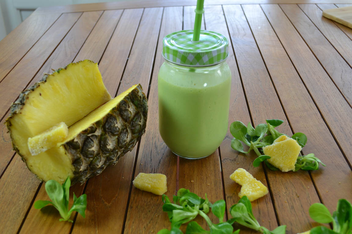Receta de batido verde saludable, rápida y fácil con sabor a piña colada. Disfruta de tu piña colada sin alcohol. Esta receta de smoothie verde gusta mucho a los niños. Es una buena forma de introducir a los niños en el consumo de smoothies verdes, con sabores que les resultan agradables y apetecibles.