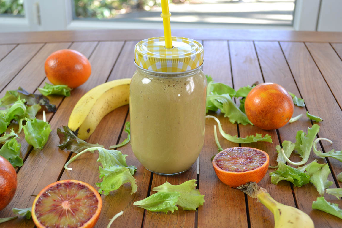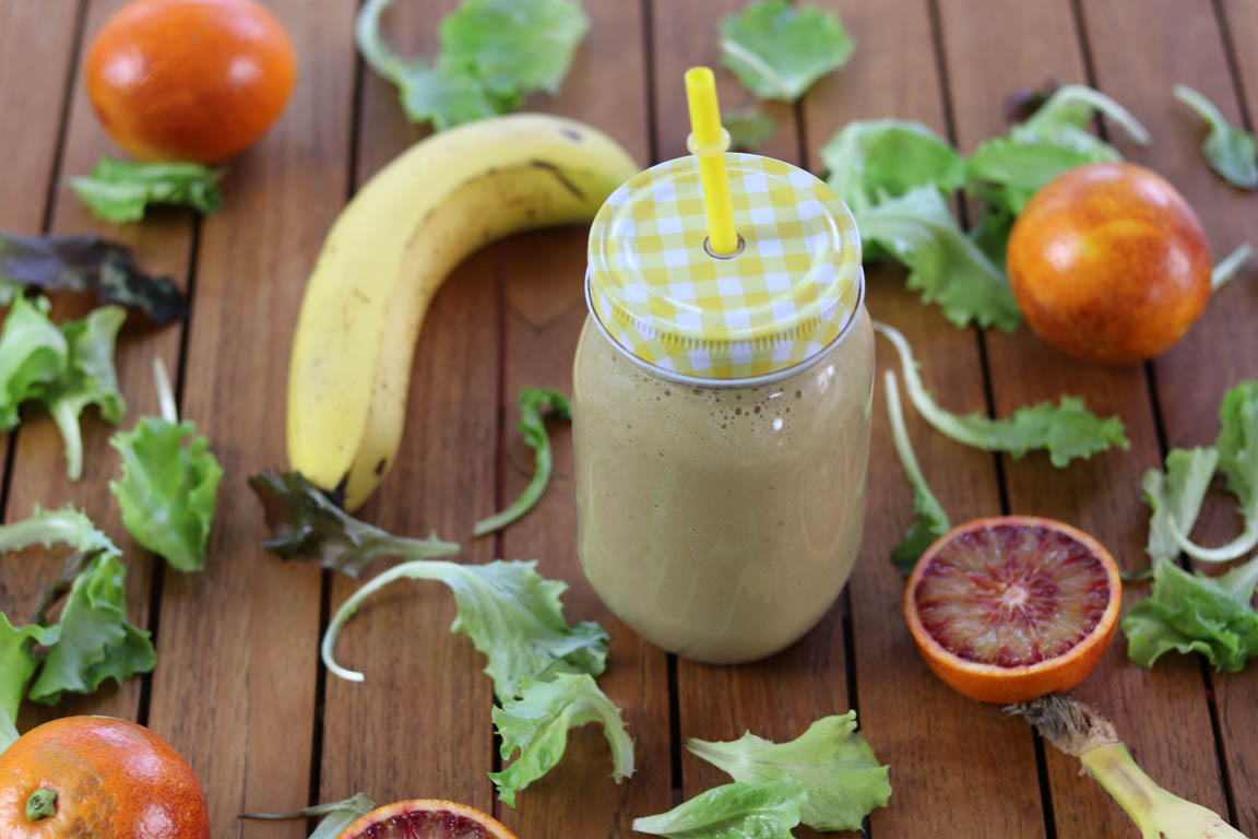 Receta de batido o smoothie verde con naranja y plátano. Receta de batido verde muy fácil, sin lácteos, para preparar un desayuno rico en antioxidantes y en fibra.