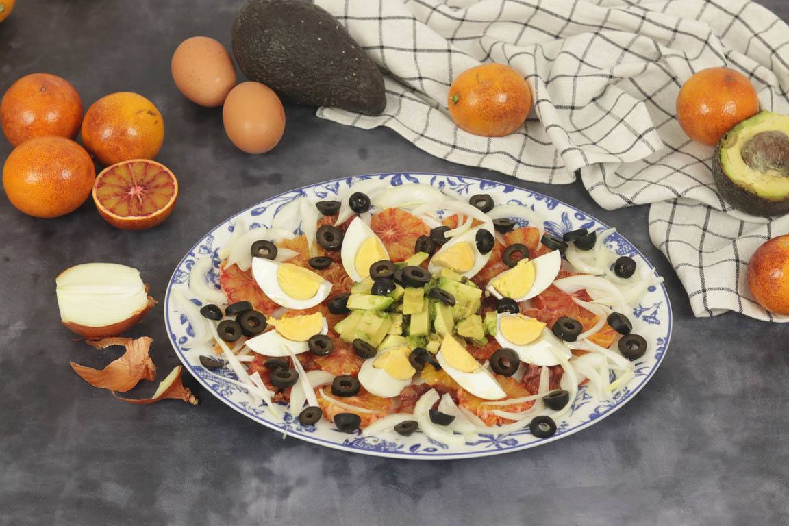 La ensalada de naranja sanguina con huevo y aceitunas es una ensalada que juega con lo colores de los diferentes ingredientes para que ña ensalada de naranja sea más apetecible.