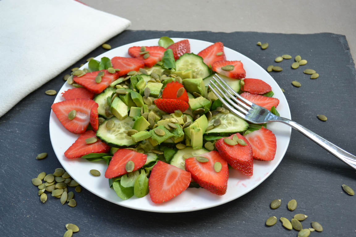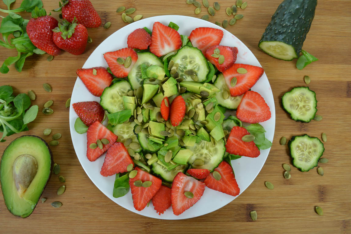 ENSALADA DE PEPINO, AGUCATE Y FRESAS
