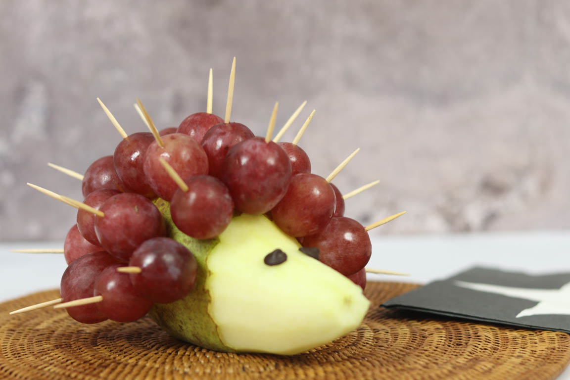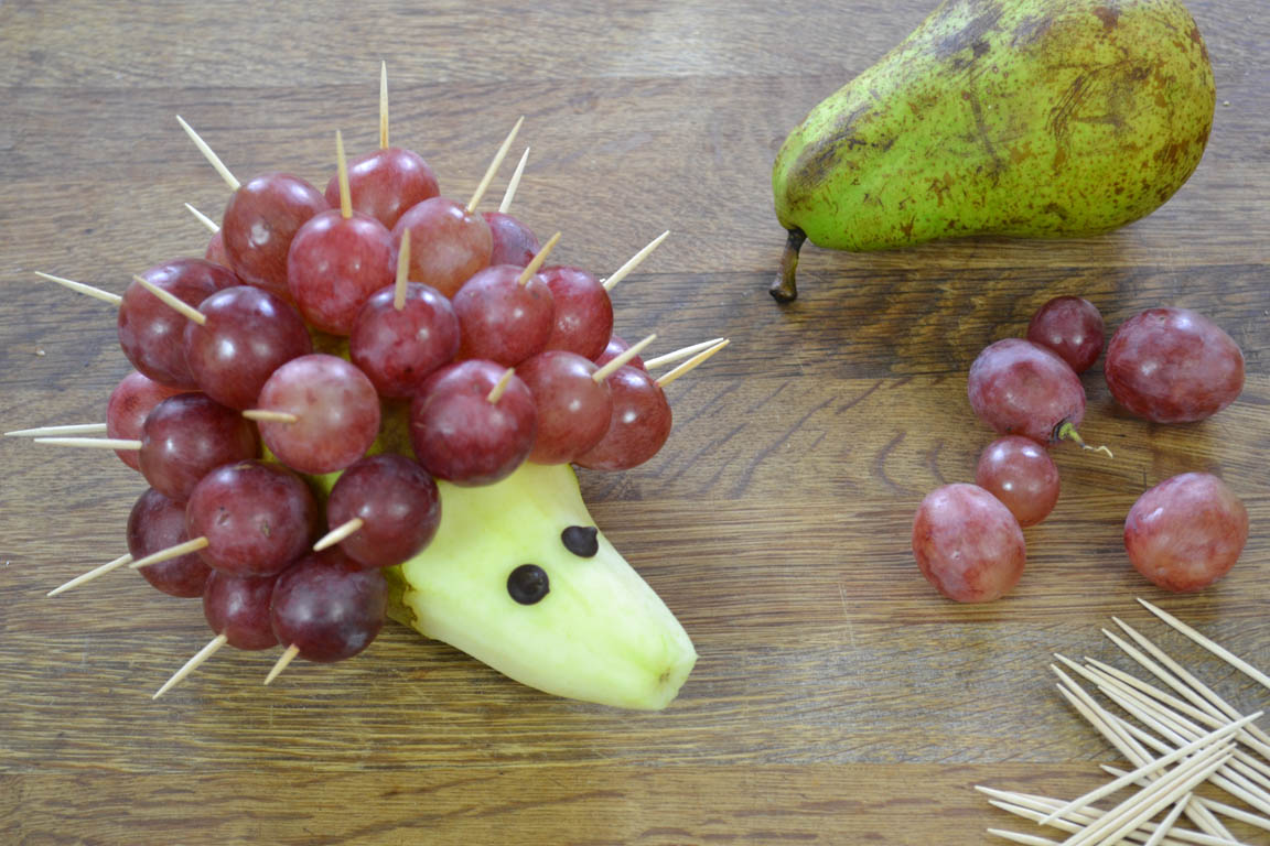Podemos jugar con las formas y los colores de la fruta para presentar platos atractivos com el erizo de pera y uvas.