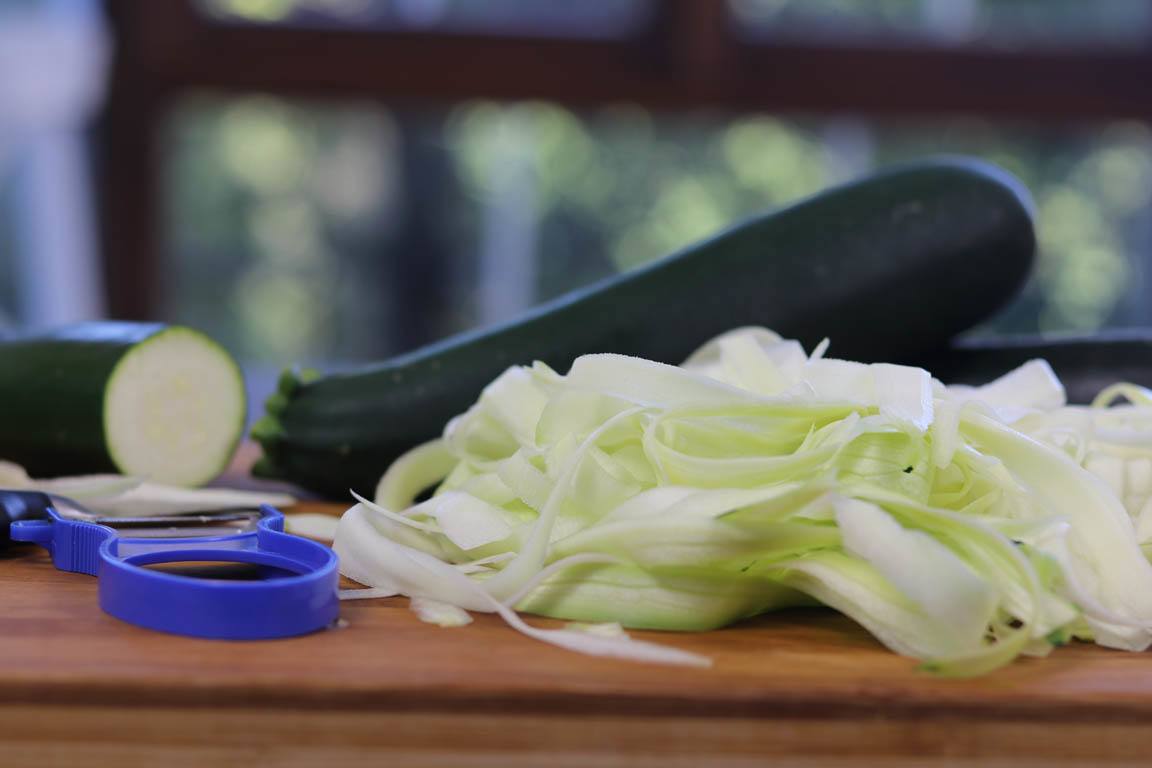 Paso a paso para preparar tallarines de calabacín sin necesidad de tener un espiralizador en casa. Simplemente utilizando un pelapatatas podemos ir sacando láminas finitas a modo de tallarines o cintas hasta llegar a la zona de las pepitas. .