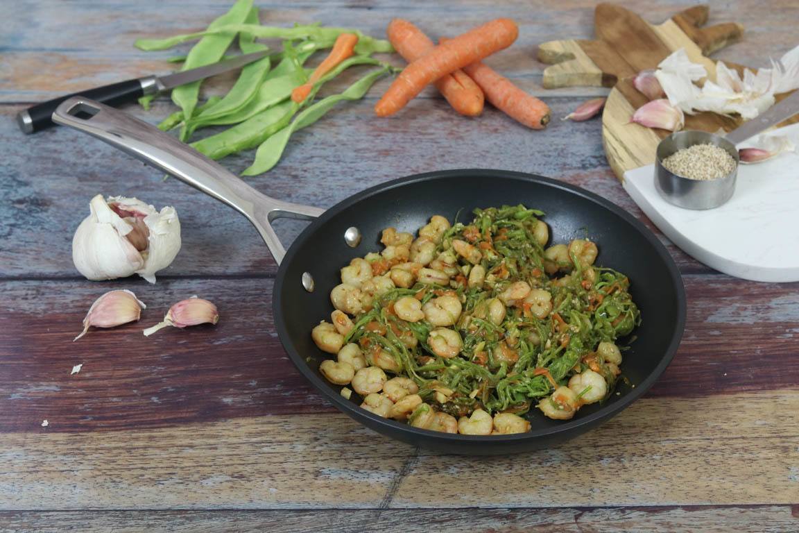 ESPAGUETIS DE VAINAS Y ZANAHORIA CON GAMBAS