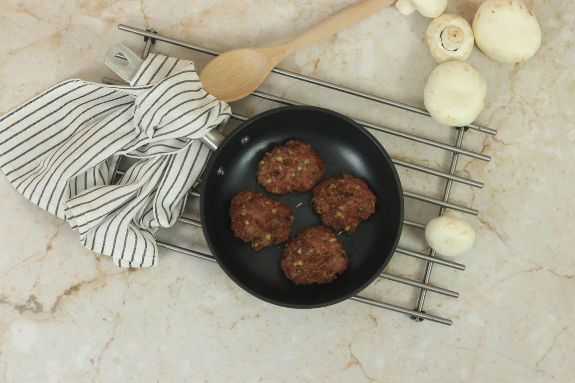 Las hamburguesas son probablemente una de las recetas preferidas de muchos niños y también de muchos adultos. Las hamburguesas o tortitas de carne son muy fáciles de comer y además permiten camuflar algunos ingredientes como en este caso los champiñones y el queso para mejorar su perfil nutricional.