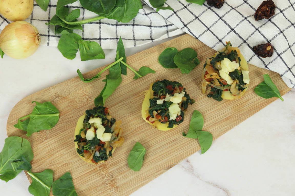 Las receta se patatas rellenas pueden ser infinitas ya que los rellenos pueden ser muy variados. En este caso la receta de patatas rellenas de espinacas y tomate seco se trata de una receta totalmente vegetal apta para dietas veganas.