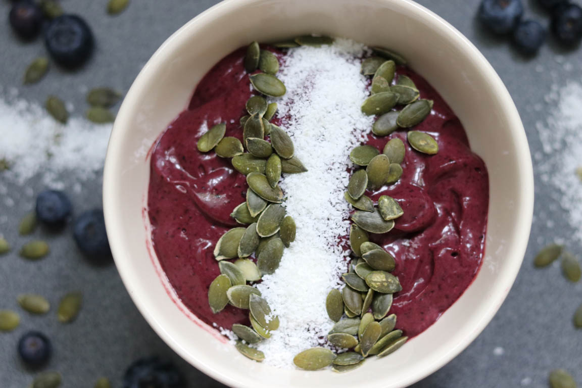 Receta de smoothie bowl muy fácil para el desayuno con aguacate, arándanos y plátano.