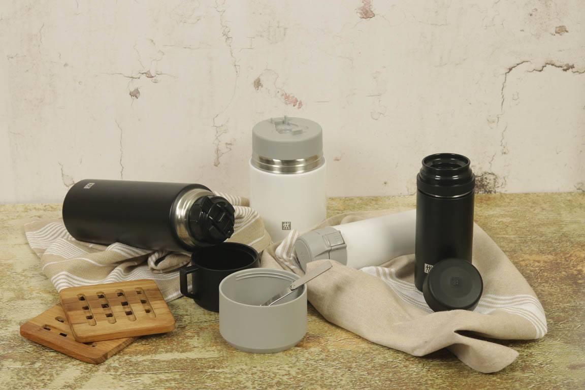 Variedad de termos para llevar la comida y la bebida.