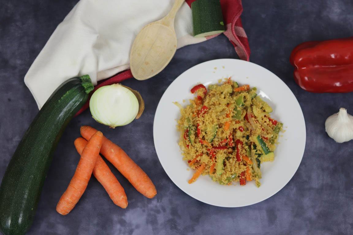 La combinación de cuscús con verduras cocinadas en el wok es rápida y fácil de preparar. Probablemente lo más largo de esta receta es trocear las verduras.