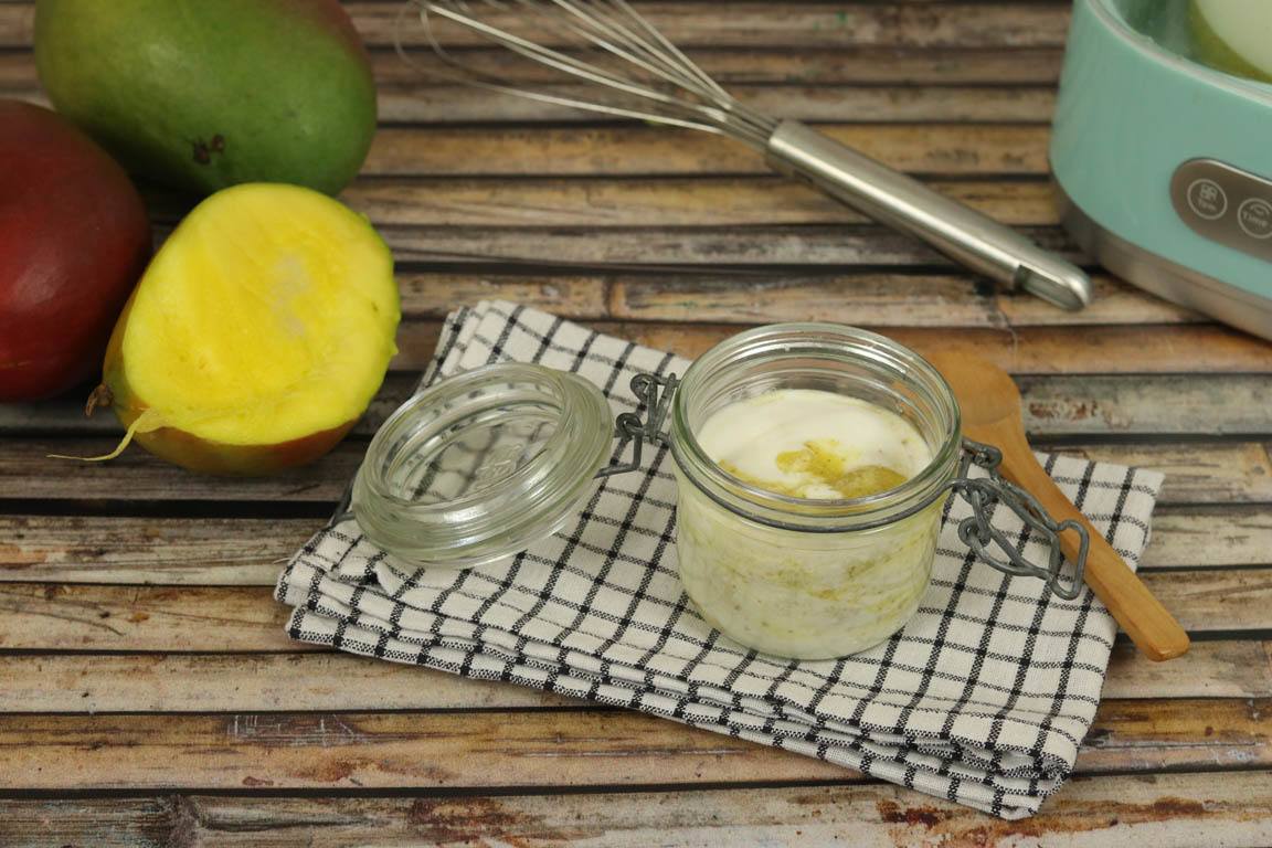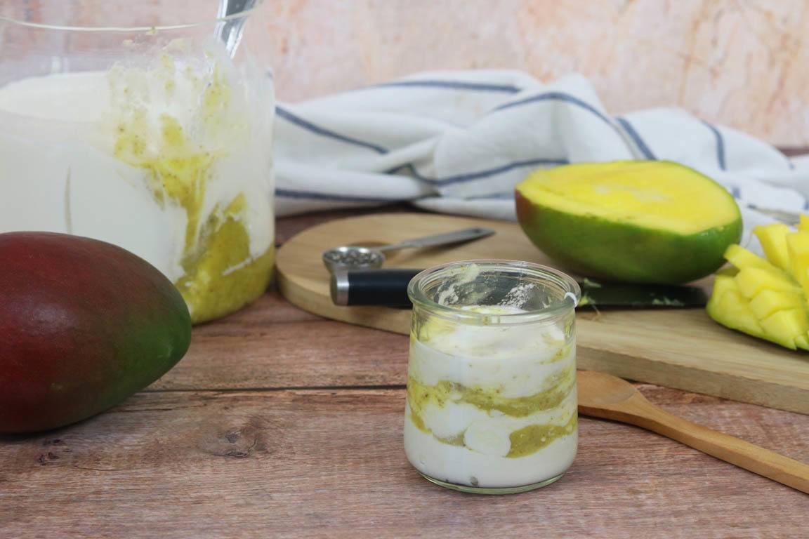 El yogur con mermelada de mango además de riquísimo es muy vistoso ya que quedan perfectamente separadas la capa de la mermelada de mango y la de yogur. Pero además es que es una mermelada de mango con truco porque no lleva azúcar así que la diferencia con el yogur comercial es importante a nivel nutricional.